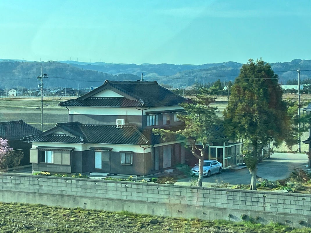 This last picture taken at speed from the coach is a good example of the many impressive rice farmers' houses. Built on raised platforms, the house normally has a lovely manicured garden, often with a cherry tree on display and surrounded by the rice fields from which they make their living.