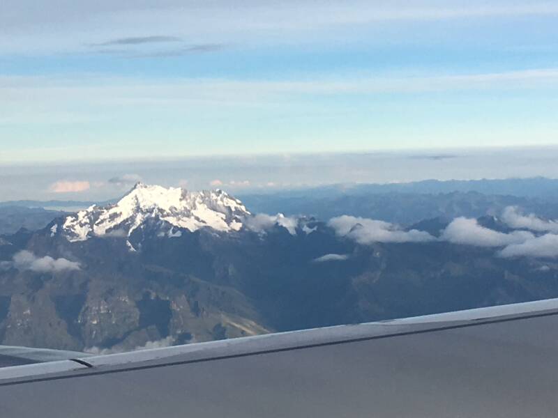 A view just after take off from Cuzco of snow capped mountains on the edge of the Andes.